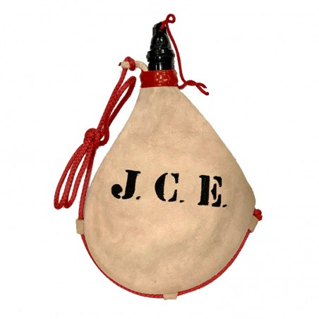 Bota de vino Las Tres ZZZ clásica, de forma curva y PERSONALIZADA, interior pez (resina vegetal) y exterior de piel de cabra, es la bota tradicional, recomendada para vino y licores hasta 30º de alcohol. No apta para refrescos, bebidas carbónicas o licores de alta graduación. Fabricada en Pamplona (España).