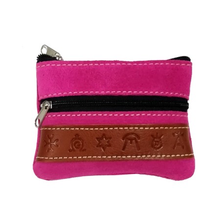 Monedero serraje "hierros de ganadería", Doble cremallera. De diferentes combinaciones es de ante y tira de piel con símbolos de hierros de ganadería. Por su tamaño, es ideal para monedas o tarjetas.