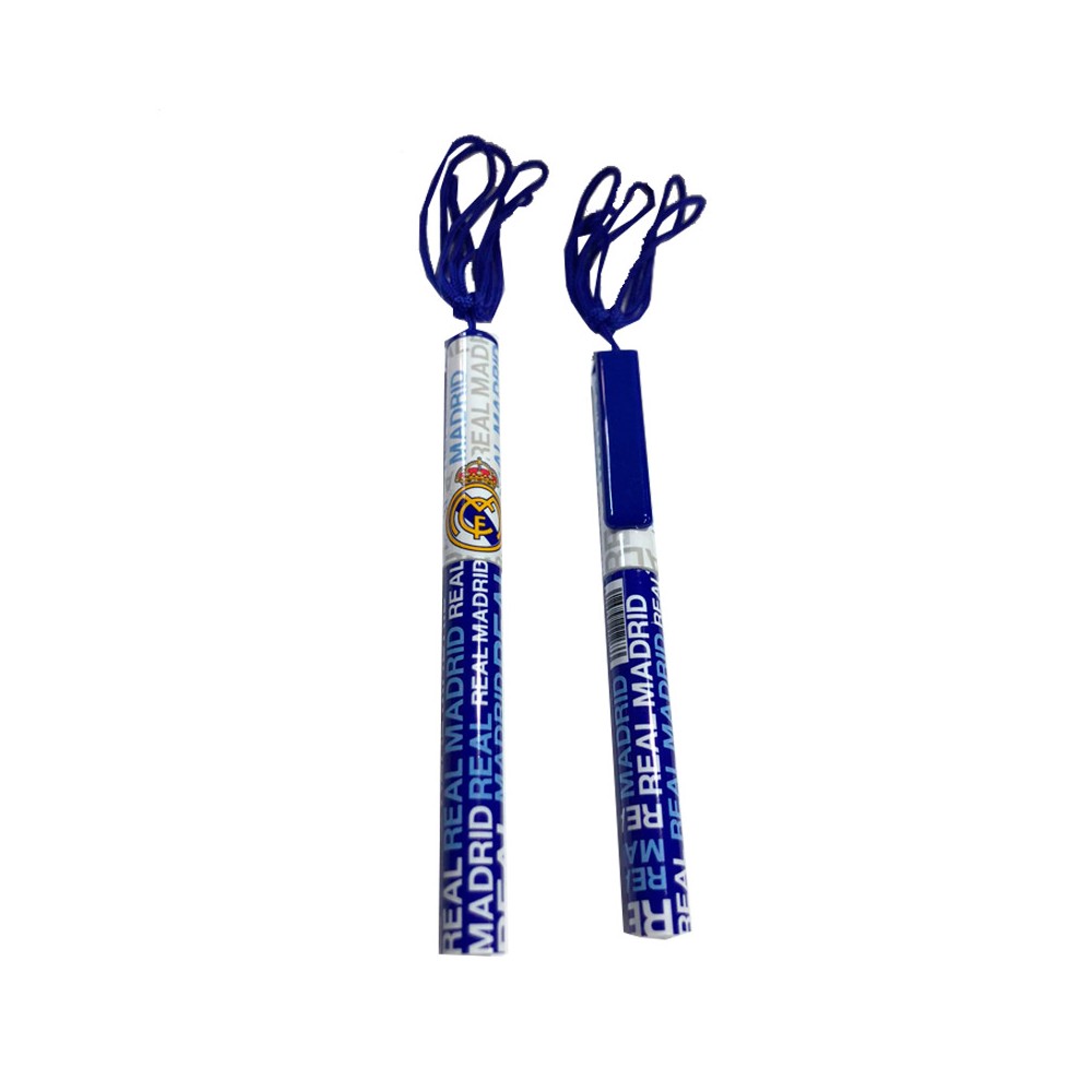 Bolígrafo "Real Madrid " de tinta azul y por fuera dos modelos, azul o blanco. Lleva cordón para colgarlo y asi no perderlo.