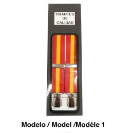 Tirantes elásticos con bandera de España. Regulables con cierre metálico de clip adaptables, con 4 pinzas de enganche (modelo 1) y con 4 pinzas anchas (modelo 2). Tejido elástico, fabricado en España. Color azul marino con la bandera de España en el centro y color Bandera de España completo. Se presentan en caja.