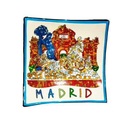 Plato cuadrado modelo "Madrid" con técnica Trencadís, mosaico tipo Gaudi, lleva los monumentos mas emblemáticos de Madrid, La Cibeles, La Puerta de Alcalá y el Oso y Madroño. precioso recuerdo de España, que vestirá tu cocina ó como cenicero, vacía bolsillos, para aperitivos, muy alegre.