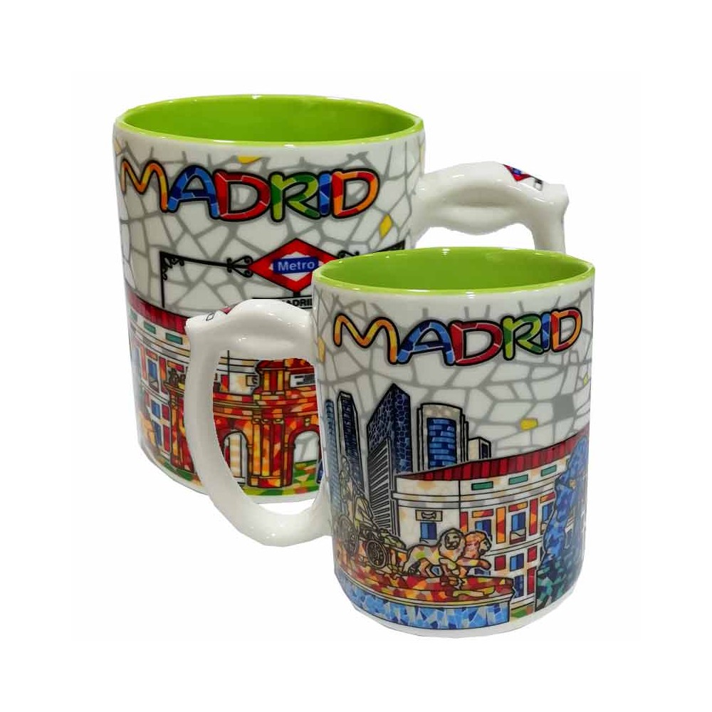 Taza Mug "Madrid Trencadis" alegre y divertida taza tipo mug con diseño de monumentos emblemáticos de Madrid y la técnica trencadis, de Gaudí. cambian los colores del interior. Apto Microondas y Lavavajillas. Capacidad 300 ml.