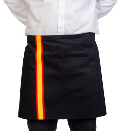 Tablier de taille PERSONNALISÉ de couleur noire avec le drapeau espagnol sur le côté, poches centrales et rubans fabriqués à partir du tissu lui-même. Tissu sergé 240gr x mètre carré. Composition de 65% polyester et 35% coton.