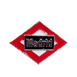 Divers pins en métal représentant Madrid, les armoiries de la ville avec l'Ours et l'Arbre à Arbustes, et une plaque d'immatriculation madrilène ornée des silhouettes des monuments les plus emblématiques de Madrid. Souvenirs de Madrid.