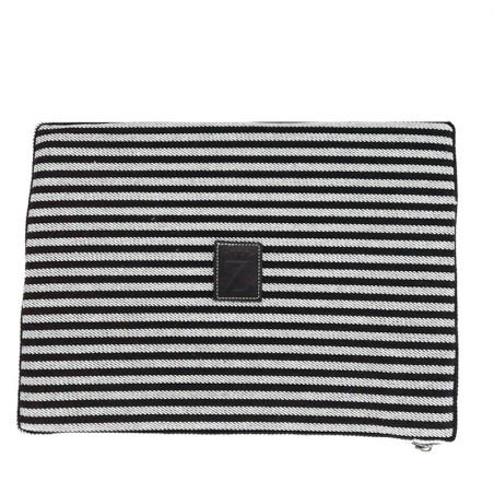 Coussin á la corrida rayée en "noir et blanc", pour mieux être à l'aise dans l'arène, dans le stade de football ou dans le champ. La couverture est tissue et le dos est en simili-cuir noir, a la poignée cuir et fermeture à glissière.