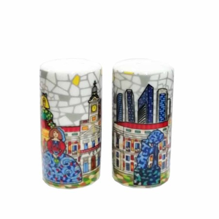 Salière et poivrière "Madrid Trencadis" en porcelaine avec motifs de monuments de Madrid. Passe au micro-ondes, usage alimentaire.