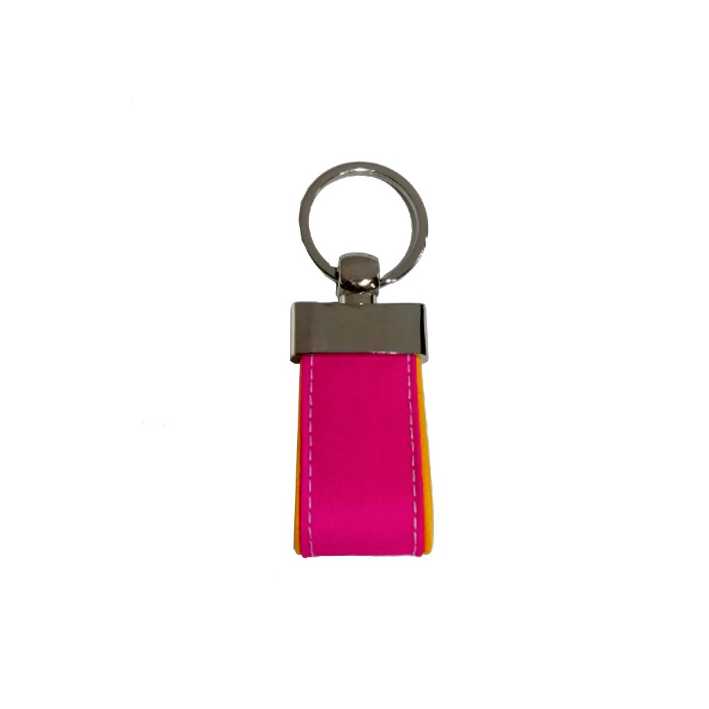 Ce porte-clés en forme de cape est confectionné en cuir et orné d'une capelette brodée. De couleur fuchsia et ocre, à l'image des authentiques capes de tauromachie, il mesure 7,5 cm x 4 cm. Son anneau métallique robuste, à la finition chromée brillante, permet d'accrocher vos clés avec élégance et sécurité.