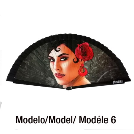 Sevillana avec un éventail de taille mini, en céramique de la marque Creaciones Nadal, en trois couleurs : blanc, rouge et noir. Il est envoyé dans une boîte hermétiquement fermée et protégée, avec son certificat d'authenticité.