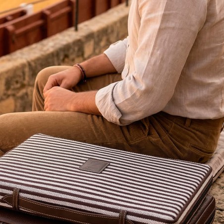 The "BROWN AND WHITE" striped bullfighting pad is the ideal solution for comfort in the bullring, at the football stadium, or on the field. The fabric is stirrup blanket and the back is brown leatherette. It has a leather handle and zipper.