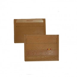 Card holder for men or women in wrinkled leather, caramel color with detail of the "Flag of Spain" in fabric. It has a central pocket for bills and four slots for credit cards. It is flat and very comfortable to carry in your pocket. Composition: 100% cow leather and fabric. Measures: 10 cm x 7.5 cm