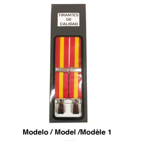Adjustable straps for pants, with Spanish flag in blue color, with 4 hitch clips (model 1) and three clips (model 2) elastic fabric and metal closure. One size. Made in Spain.
