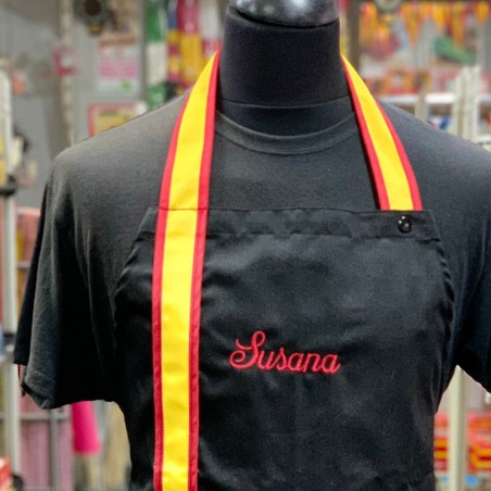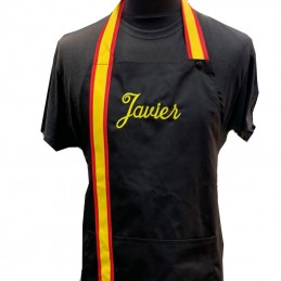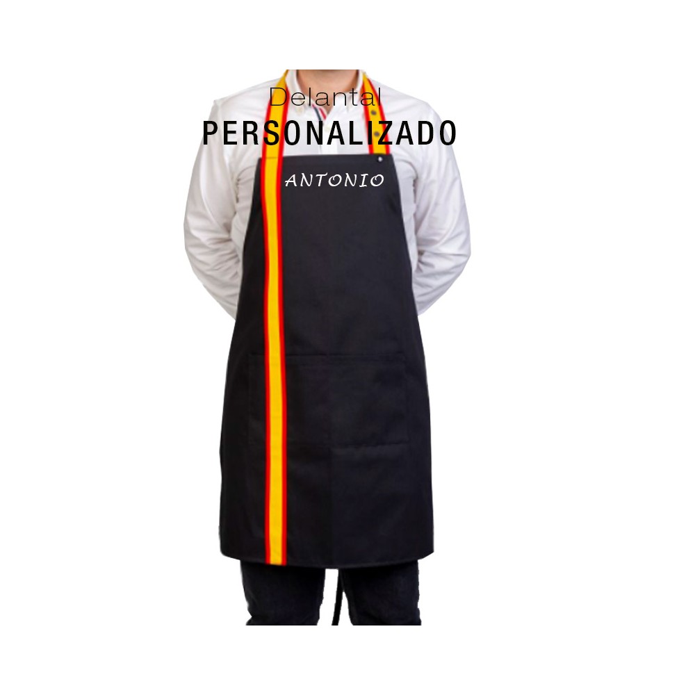 Kitchen apron with Spanish flag bib, for adults, CUSTOMIZED, we have it in white, black, green and blue with central pocket and strap of the Spanish Flag, adjustable with clasps on the neck for different sizes and ribbons to tie on the back of the same fabric. If you want quantities, send us an email to info@zings.es and we will confirm availability. As it is a personalized item.
