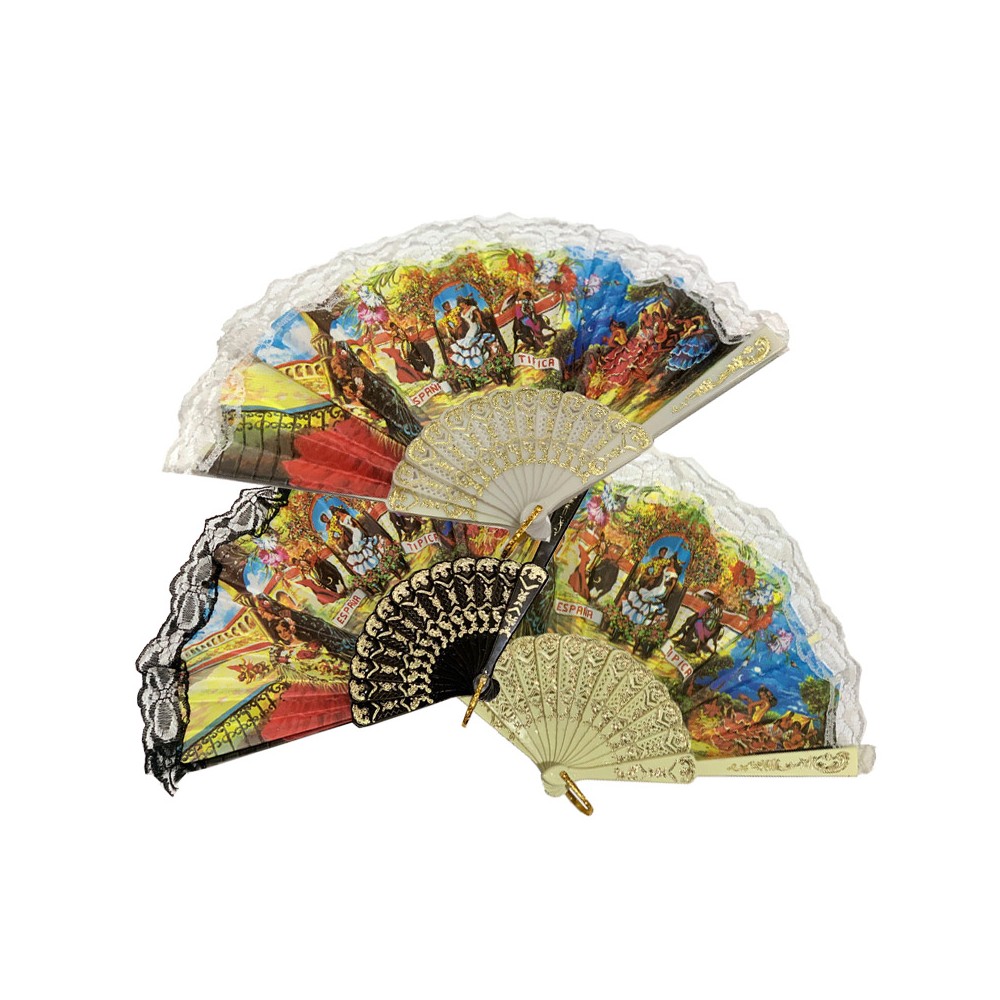 Nicely fans decorated with typical scenes of Spain (flamenco dancers, bullfighters, etc.) and finished with lace. Available in three colors: white and brown the small size (13 cm large), white, beige and black in the medium size (9.4'' long) and black and white in large (11.7'' long). Made in plastic and lace.