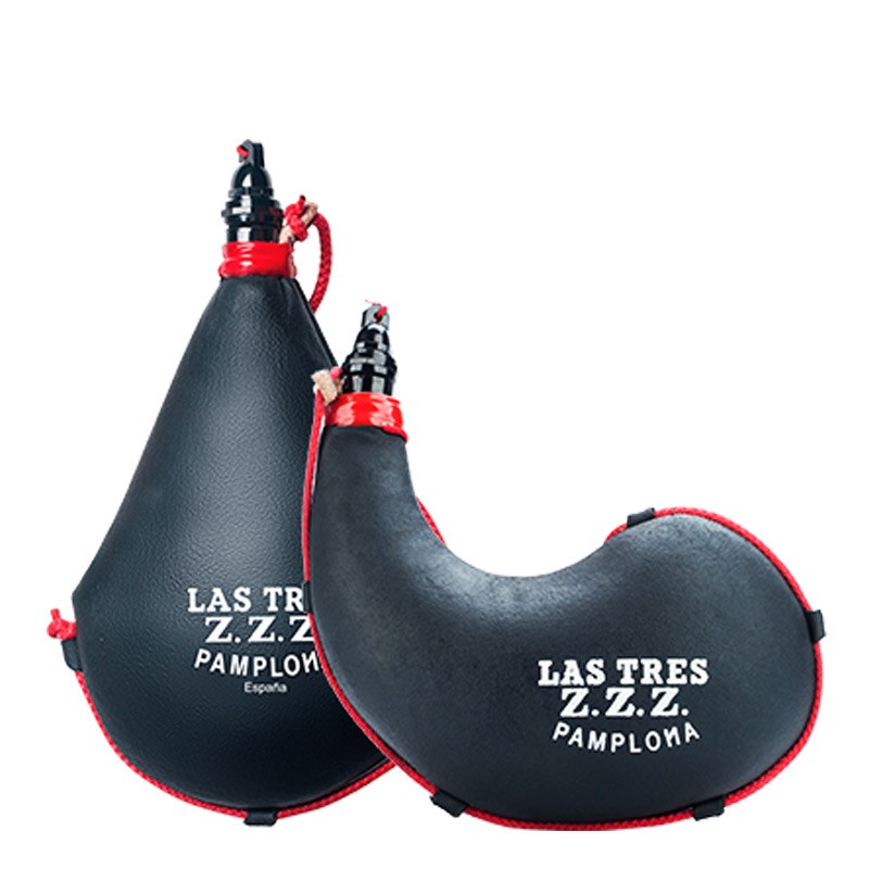 Wineskin Las Tres ZZZ. Made of genuine first class goat skin, free of stains and cuts, vegetable tanned by traditional process and treated for impregnation of pez. That is what difference from the traditional one. Care instructions inside. Curved and black color. Made in Spain.